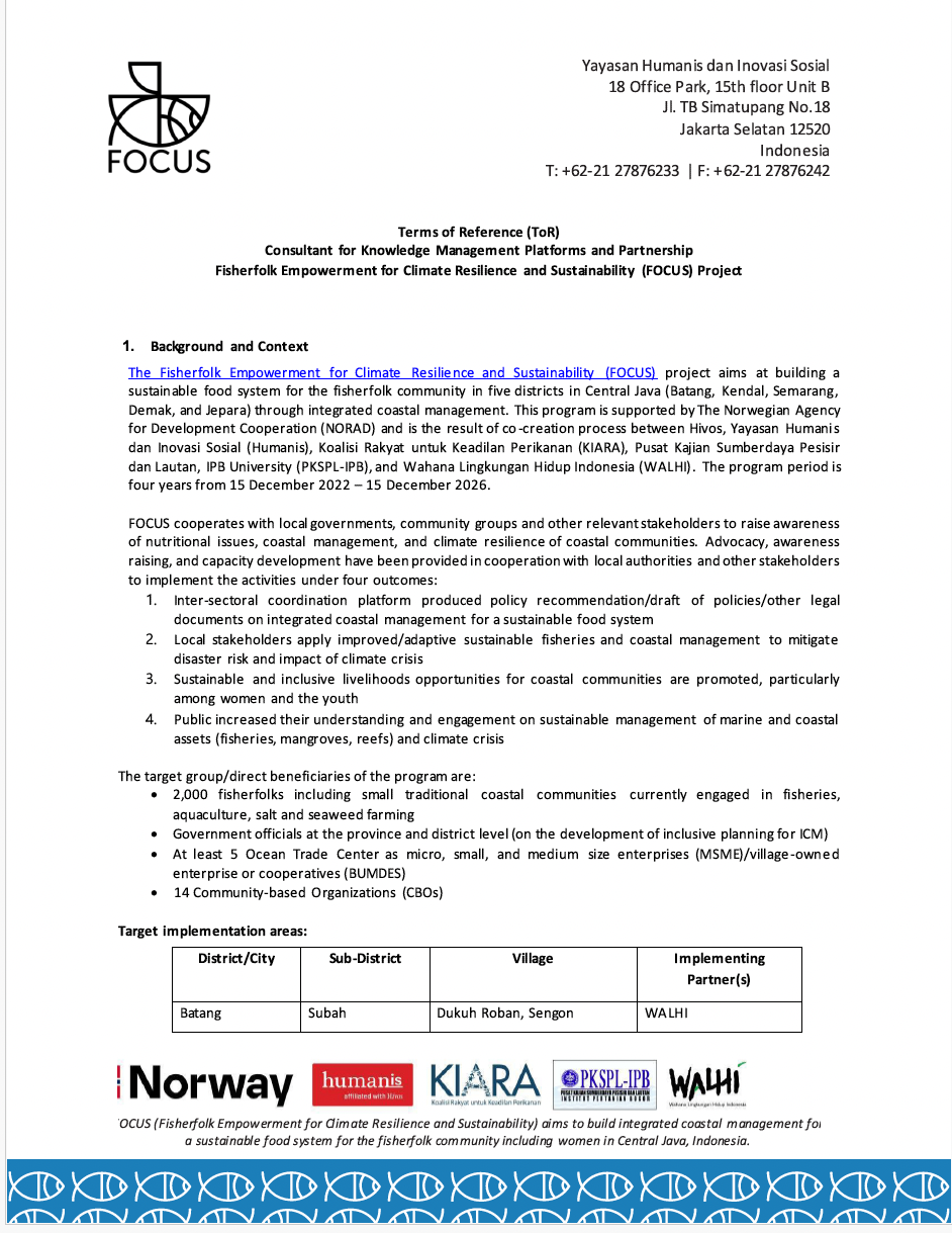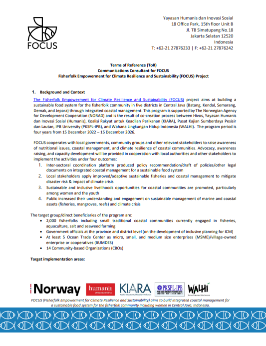 Feb 24, 2026 Views 9Key Responsibilities The Consultant will assist in the development, management, and dissemination of the project’s communication materials to support the achievement of the project goals and expected results. The consultant will report directly to the FOCUS Project Manager at Yayasan Humanis and work in close collaboration with communication personnel of FOCUS Consortium members and Yayasan Humanis Communications Manager (if required).